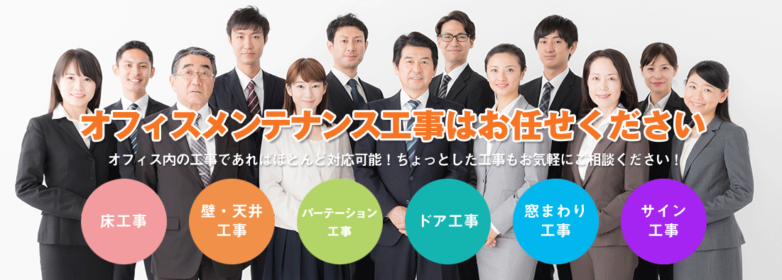 まで対応可能 - 石狩オフィスづくり.comでは、ドア工事や窓まわり工事、部分的な補修のようにどこに相談したらいいか分からないようなちょっとした小規模工事からオフィスリニューアルやオフィス内装工事、パーテーション工事など大規模工事まで対応することができます。