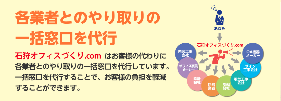 一括対応 - 担当者様にとってオフィスづくりの業務は大変な負担となります。オフィスづくりでは、あらゆる業者とやりとりをする必要が出てきます。日常業務に加え、業者の選定や打ち合わせや工程の管理などで、担当者様が大変な思いをします。石狩オフィスづくり.comが担当者様の代わりに一括して各業者とのやりとりの窓口となります。また、弊社はオフィスづくりのプロなのでミスを減らして高品質なオフィスづくりをスピーディにご提供することができます。